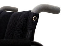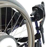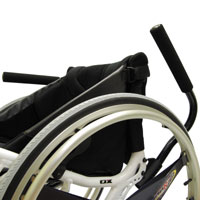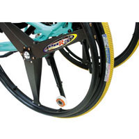 介助者が車いすの前輪を上げるときに使用します。 グリップに手を添え、ティッピングバーを踏み込むと前輪が上がります。 *ウィリーバーとは同時装着できません |